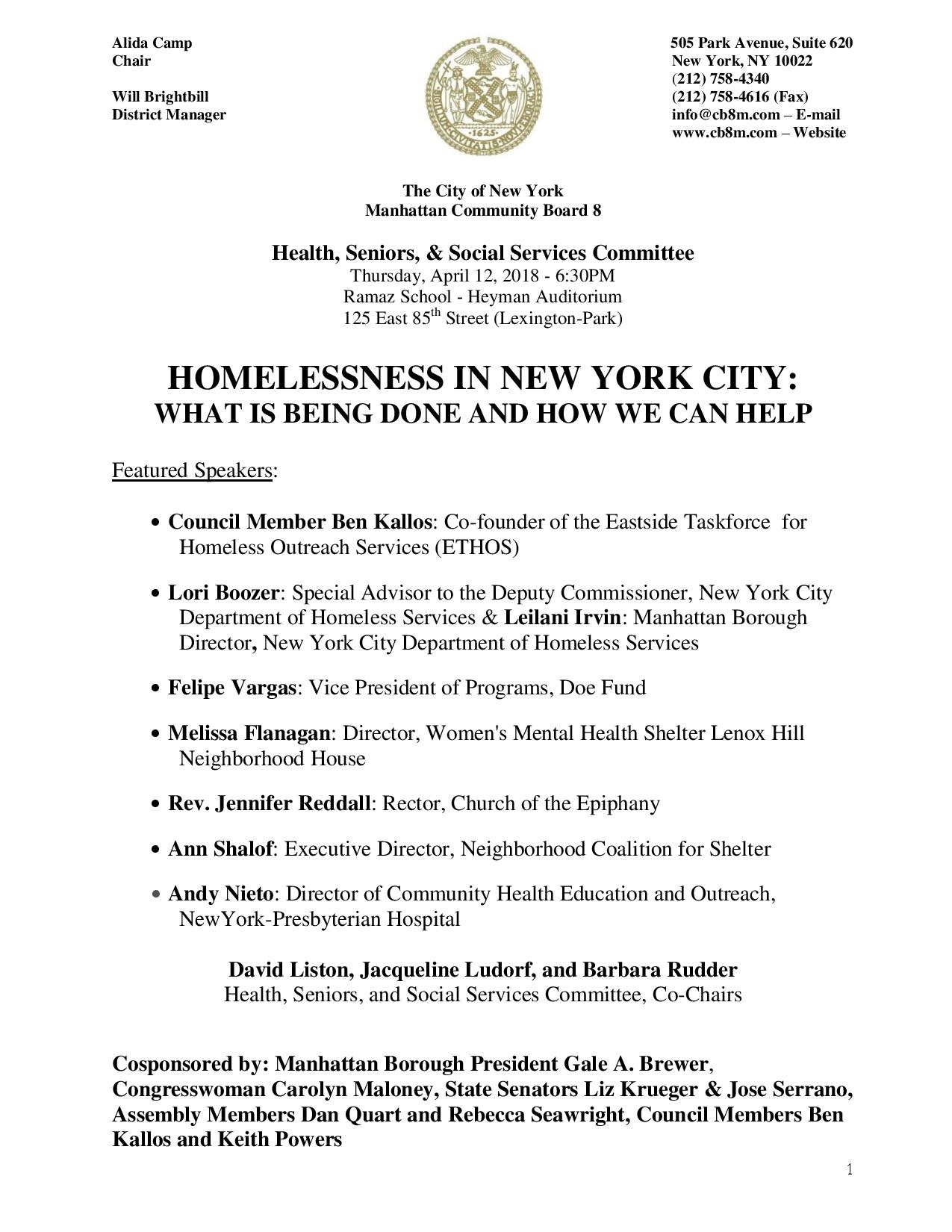 Cosponsored by: Manhattan Borough President Gale A. Brewer, Congresswoman Carolyn Maloney, State Senators Liz Krueger and Jose Serrano, Assembly Members Dan Quart and Rebecca Seawright, Council Members Ben Kallos and Keith Powers