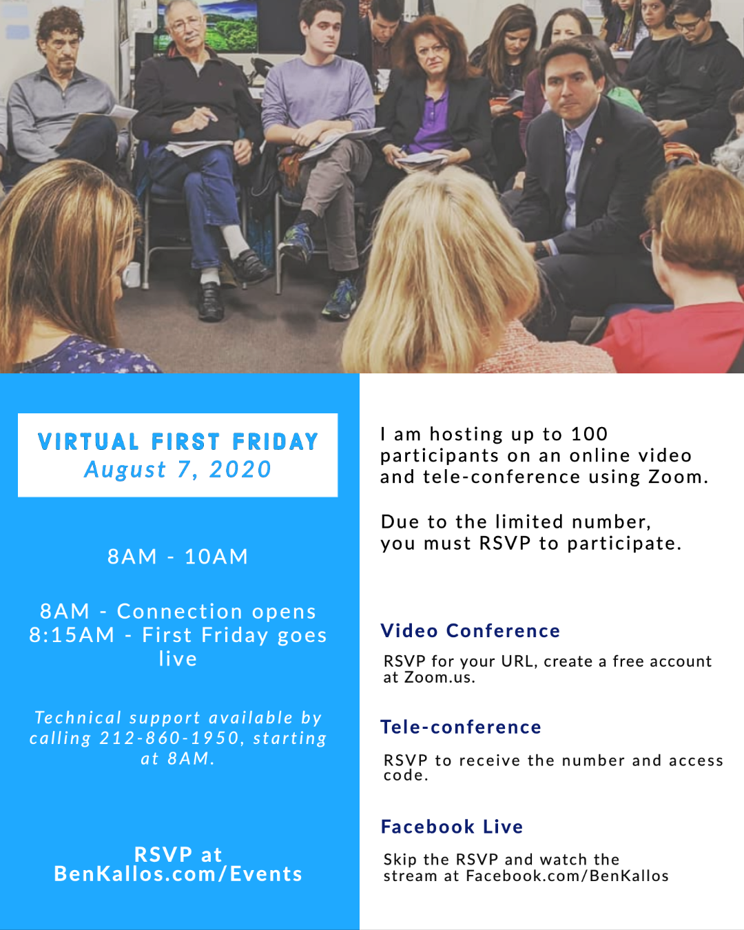 Add to Calendar 2020-08-07 08:00:00 2020-08-07 10:00:00 First Friday Online First Friday remains one of my favorite parts of my job as your Council Member. Though a virtual conversation is still the safest way to host group events, I want to listen to and address your concerns as we work together for a better city. You must RSVP to participate by Zoom. Zoom link will be sent by email. If you do not receive the link by an hour before the event check your spam. Questions should be submitted with RSVP or by email to questions@benkallos.com   Teleconference: RSVP to receive the number and access code. Video Conference: RSVP for your URL, create a free account at Zoom.us. Facebook Live: Skip the RSVP and watch the stream. First Friday will run from 8:00AM to 10:00AM Connection opens at 8AM. Teleconference and video will go live at 8:15AM. Technical support available at 212-860-1950 starting at 8AM if you have any difficulty connecting. City Council Virtual New York, NY 10128 United States Ben Kallos, New York City Council Member Event Registration First Name Last Name Address Address City State - None -AlabamaAlaskaAmerican SamoaArizonaArkansasArmed Forces (Canada, Europe, Africa, or Middle EastArmed Forces AmericasArmed Forces PacificCaliforniaColoradoConnecticutDelawareDistrict of ColumbiaFederate States of MicronesiaFloridaGeorgiaGuamHawaiiIdahoIllinoisIndianaIowaKansasKentuckyLouisianaMaineMarshall IslandsMarylandMassachusettsMichiganMinnesotaMississippiMissouriMontanaNebraskaNevadaNew HampshireNew JerseyNew MexicoNew YorkNorth CarolinaNorth DakotaNorthern Mariana IslandsOhioOklahomaOregonPalauPennsylvaniaPuerto RicoRhode IslandSouth CarolinaSouth DakotaTennesseeTexasUtahVermontVirgin IslandsVirginiaWashingtonWest VirginiaWisconsinWyoming Postal Code Phone Email Video/Tele-Conference How would you like to connect to this meeting? Video on Zoom Phone Stream on Facebook Question(s) for Event Register Leave this field blank America/New_York public