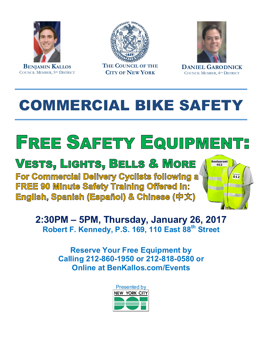 Free Safety Equipment: Vests, Lights, Bells & More for Commercial Delivery Cyclists following a FREE 90 Minute Safety Training Offered in: English, Spanish (Español) & Chinese (中文)