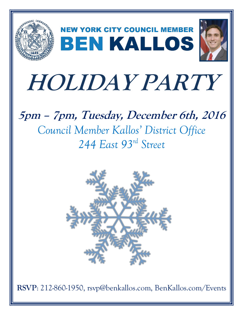 Start Time Tuesday, December 6, 2016 - 5:00pm Location District Office of Council Member Ben Kallos 244 East 93rd Street New York, NY 10128 United States