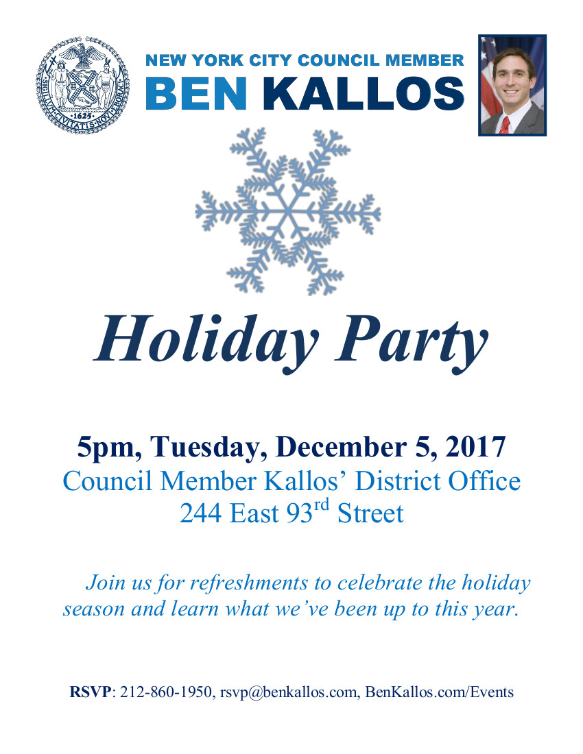 Start Time Tuesday, December 5, 2017 - 5:00pm Location District Office of Council Member Ben Kallos 244 East 93rd Street New York, NY 10128 United States