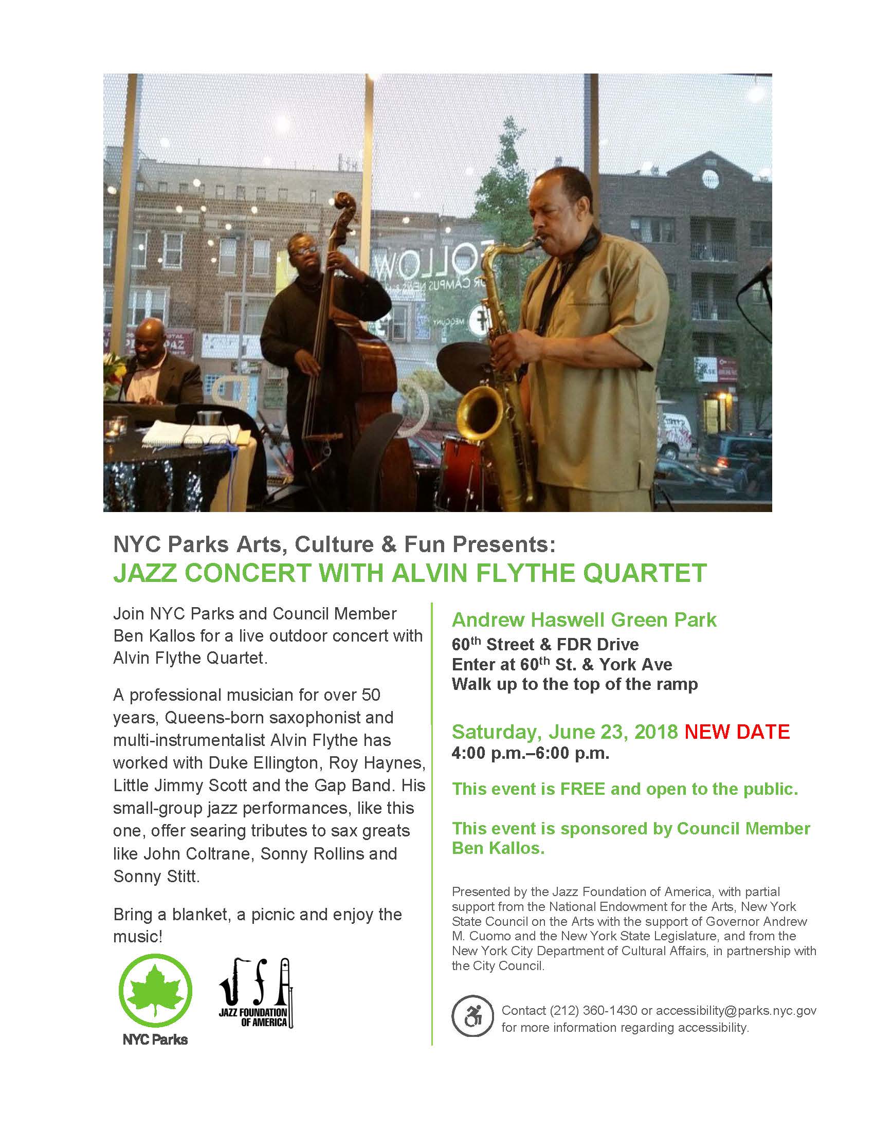 Live outdoor concert at Andrew Haswell Green Park with the Alvin Flythe Quartet.
