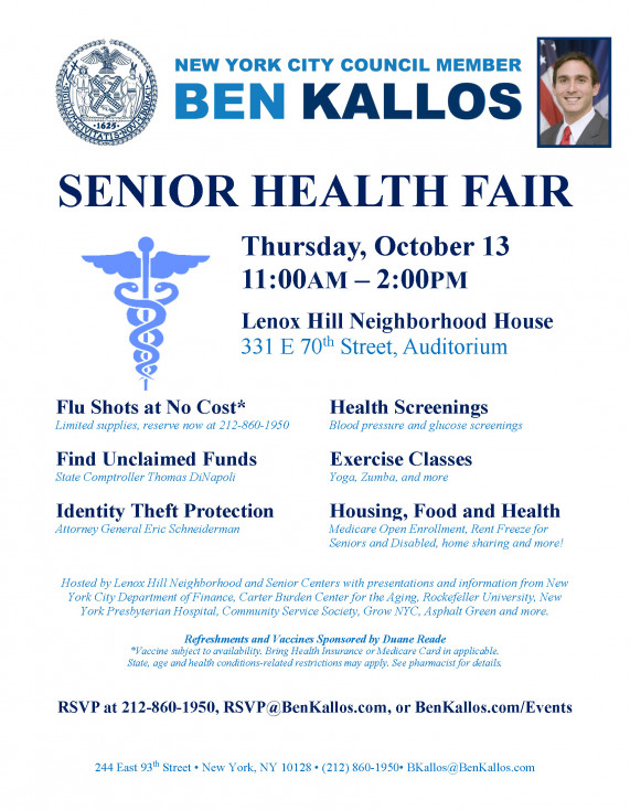 Join us for our annual senior health fair with information from New York State Comptroller Tom DiNapoli, New York State Attorney General Eric Schneiderman, New York City Department of Finance, Lenox Hill Senior Center, Carter Burden Center for the Aging, Rockefeller University, New York Presbyterian Hospital, Community Service Society, Grow NYC, Asphalt Green and more who will be providing: