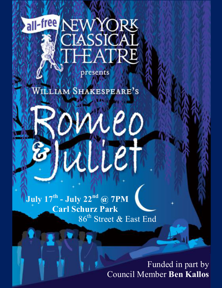 Add to Calendar 2018-07-19 19:00:00 2018-07-19 21:00:00 Shakespeare in Carl Schurz Park: Romeo and Juliet All performances begin @ 7pm 120 minutes, no intermission No tickets required! More information at NewYorkClassical.org Outdoors Ticketing: All New York Classical Theatre rehearsals and performances are Free and Open to the Public. Outdoor shows are not ticketed and there are no reservations required. How it works: The audience follow the actors from place to place as the play moves from scene to scene. An average show covers approximately 3 city blocks over 2 hours. Check out our 3-minute video to see how it works! The weather: If the weather looks iffy, check the banner on the top of our homepage for updates on that day's performance. Tips for attending a production in the park: 1. Wear comfy shoes. 2. Wear clothes you can sit on the ground in. (Or bring a water-resistant blanket * or light stool)  3. Do mosquitos love you? Bring some bug spray!  4. We encourage pre-show picnics, but pack something simple that you can quickly pick up and carry during audience moves. 5. Bring water. 6. Bringing a big group? Contact us at (212) 233-6496 and we can arrange a special talk with Artistic Director, Stephen Burdman! * Did you know that for a $250+ donation, we'll send you a New York Classical Theatre water-resistant blanket? For our patrons with physical challenges: With advanced notice, we are happy to assign a staff member to help guide you along. For more information feel free to contact us before a performance at info@newyorkclassical.org or call (212) 233-6496. Please note: we need 24 hours to arrange a staff member for your convenience. We are committed to making your experience as enjoyable as possible. More information at NewYorkClassical.org Carl Schurz 86th Street & East End New York, NY 10028 United States Ben Kallos, New York City Council Member Event Registration First Name Last Name Address Address City State - None -AlabamaAlaskaAmerican SamoaArizonaArkansasArmed Forces (Canada, Europe, Africa, or Middle EastArmed Forces AmericasArmed Forces PacificCaliforniaColoradoConnecticutDelawareDistrict of ColumbiaFederate States of MicronesiaFloridaGeorgiaGuamHawaiiIdahoIllinoisIndianaIowaKansasKentuckyLouisianaMaineMarshall IslandsMarylandMassachusettsMichiganMinnesotaMississippiMissouriMontanaNebraskaNevadaNew HampshireNew JerseyNew MexicoNew YorkNorth CarolinaNorth DakotaNorthern Mariana IslandsOhioOklahomaOregonPalauPennsylvaniaPuerto RicoRhode IslandSouth CarolinaSouth DakotaTennesseeTexasUtahVermontVirgin IslandsVirginiaWashingtonWest VirginiaWisconsinWyoming Postal Code Phone Email Register Leave this field blank America/New_York public
