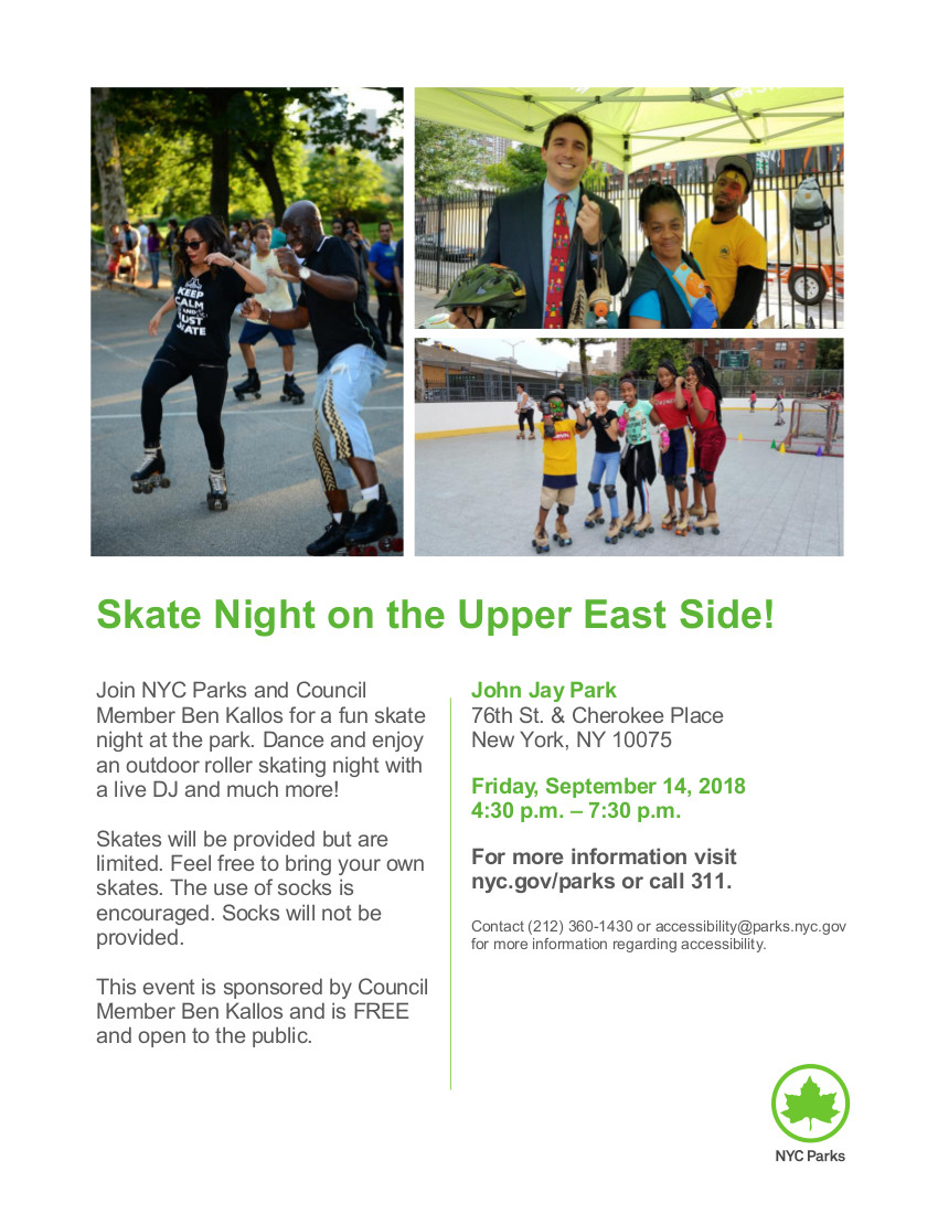 Join NYC Parks and Council Member Ben Kallos in a fun skate night in the park.