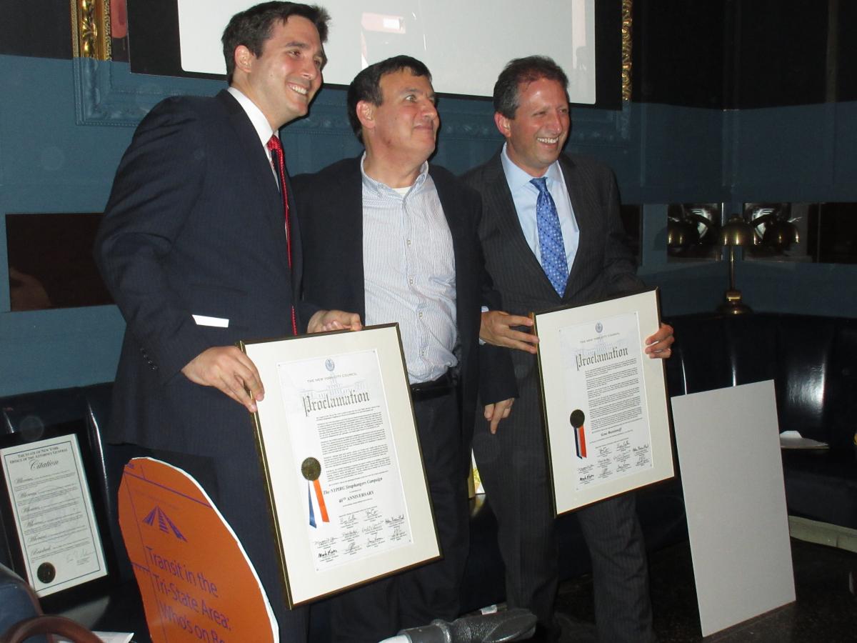 After 40 years of service from The Straphangers Campaign and New York Public Research Interest Group (NYPIRG), whose annual "Pokey Award" helped us advocate for and win Select Bus Service off-board payment for the M86 and M79, I was proud to say thank you on behalf of thousands of new riders with a proclomation recognizing the orgnaizations and their leader Gene Russianoff for their service.